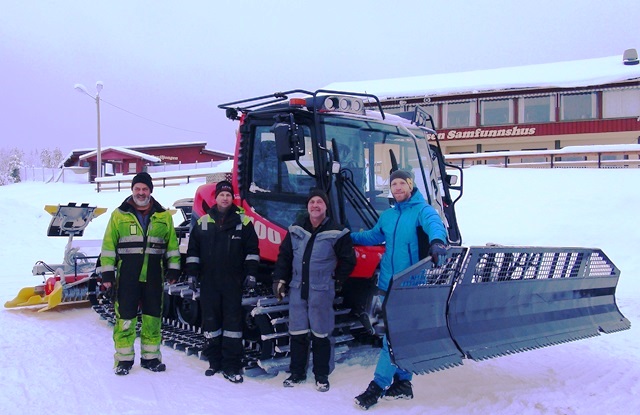 Dette er realisert gjennom midler fra Raskiftefondet, og en grundig og god prosjektering av høringsgruppa som grendeutvalget har nedsatt. Via Søre Osen IL og løypelaget Utogkut, blir det nå laget en helhetlig plan for skiløypenettet i grenda. På bildet ser vi fra venstre Jørn Barkenæs og Odd Ivar Hemstad fra leverandøren Antra, Roger Bronken og Erik Harviken som begge har vært sentrale i prosjekteringen. Maskina er en Kässbohrer PistenBully 100.