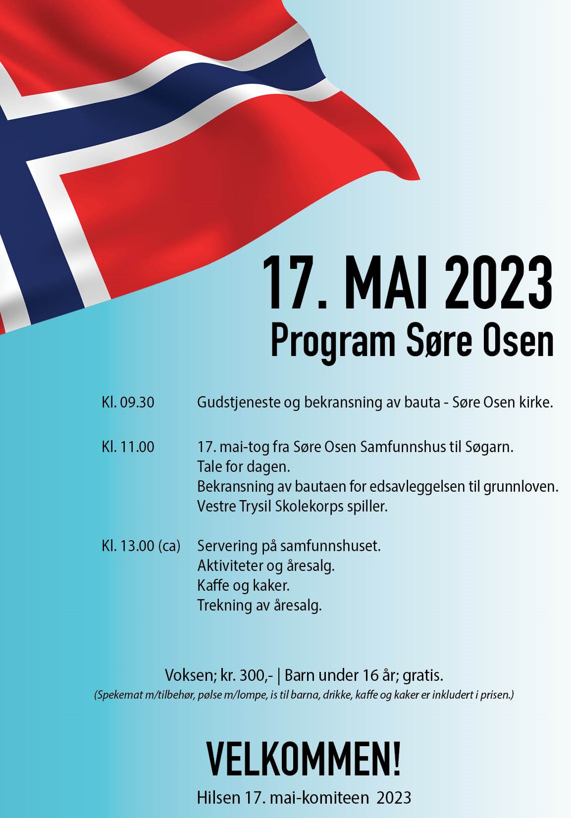 Årets 17.Mai komite er i god rute til grunnlovsfeiringa. Det legges opp til tradisjonell feiring og i inngangsbilletten inngår all bevertning; spekemat m/tilbehør, drikke, pølser, brus og is til barna. Kaffe og kaker er også inkludert i prisen. Diverse aktiviteter og åresalg. Komiteen ønsker alle i hus og hyttet hjertelig velkommen.