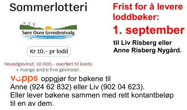 Sommerlotteriet i regi grendeutvalget pågår fremdeles, men for å få full oversikt over bøkene ønsker Anne og Liv å få inn alle INNEN 1.SEPTEMBER,