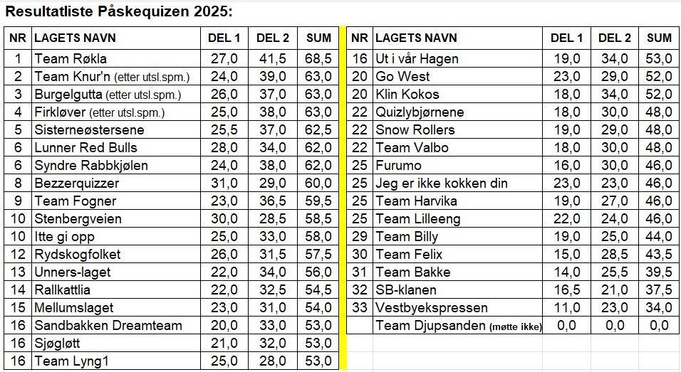 Resultatliste påskequizen
