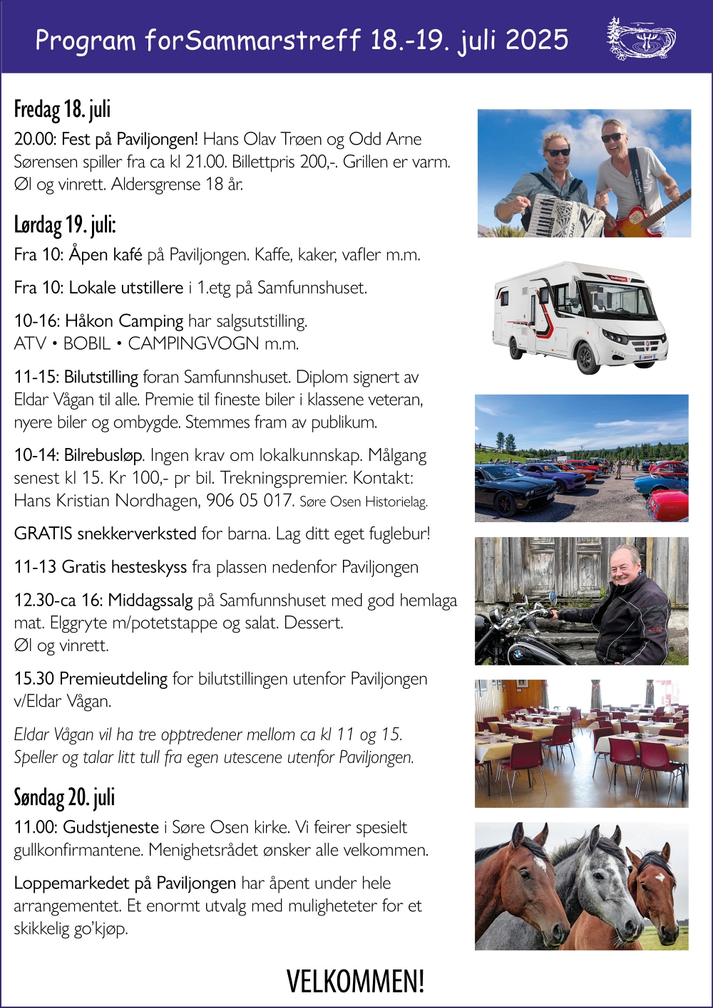 Programmet er nå klart. Det er GRATIS å se/høre Eldar Vågan, Bare å sette av helga i uke 29, å få deg en hyggelig opplevelse!
