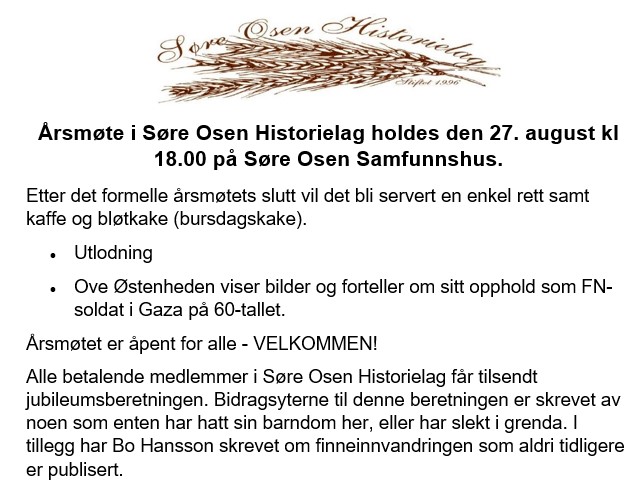 Historielaget avholder sitt årsmøte fredag 27.august kl 18.00 på Samfunnshuset. Laget ble stiftet i 1996, og har dermed eksistert i 25 år. De har laget en jubileumsberetning på over 60 sider som er veldig fin. Alle medlemmer har fått denne tilsendt, sammen med innkalling til årsmøtet. Som det fremgår er årsmøtet åpent for alle.