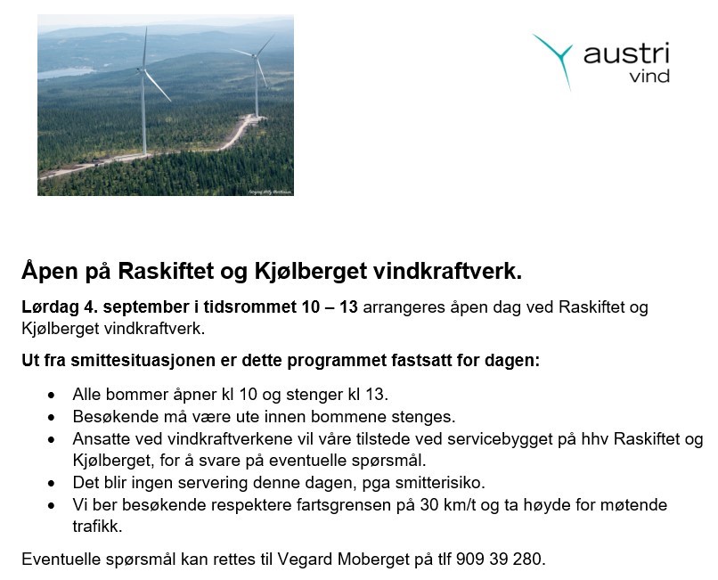 I regi de ansatte i Raskiftet og Kjølberget vindkraftverk, avholdes åpen dag LØRDAG 4. SEPTEMBER fra kl 10 - 13.