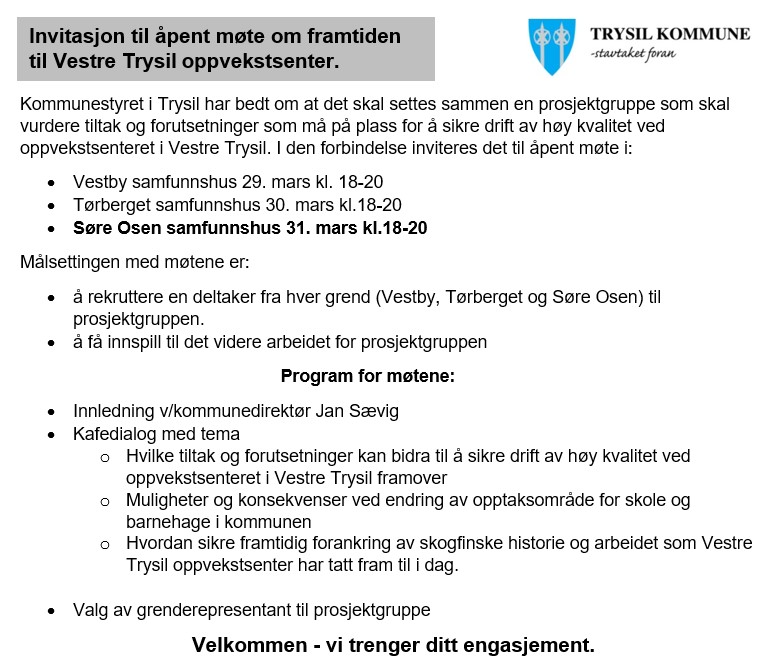 Trysil kommune invitererte til åpent folkemøte om framtiden for Vestre Trysil oppvekstsenter på Samfunnshuset torsdag 31. mars. Det var stort engasjement, og bra oppmøte. Bakgrunnen til folkemøtene var at Kommunestyret i Trysil har bedt om at det skal settes sammen en prosjektgruppe som skal vurdere tiltak og forutsetninger som må på plass for å sikre drift av høy kvalitet ved oppvekstsenteret i Vestre Trysil.