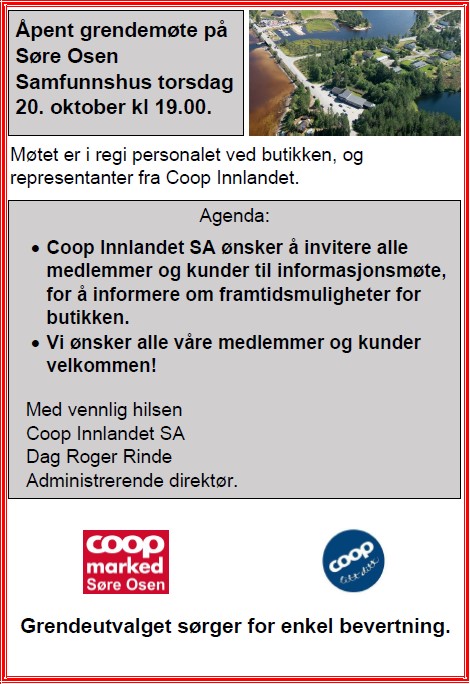 Torsdag den 20.oktober kl 19.00 blir det i regi Coop Innlandet SA og butikkpersonalet holdt et informasjonsmøte om framtiden for butikken. En må forvente møtet får god oppslutning, for å få direkte og korrekt informasjon. Grendeutvalget vil selvsagt fortsette sin bistand rundt dette, ut fra sitt mandat i slike sammenhenger.