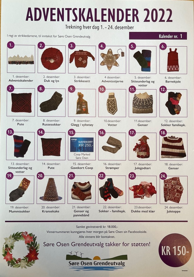 Strikkedamene i Søre Osen fornekter seg ikke – nå har dem laget en haug med fine gevinster, som kan vinnes via en adventskalender. Hver dag fra 1. – 24. desember trekkes det ut en vinner. Kalenderen koster 150 kr, og inntekten går til driften av Grendeutvalget. Kalender kan kjøpes av bl.a. Åse Ifarnæss, tlf 416 65 129. Kan vippse til de som selger. Ligger også kalendere til salgs på butikken.