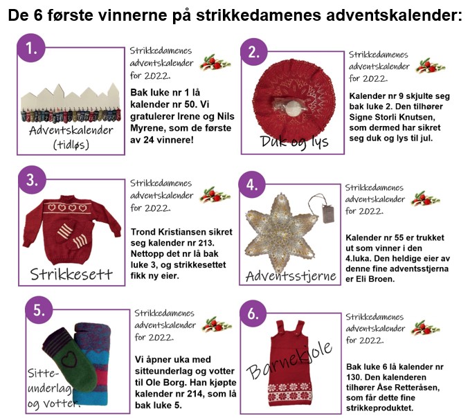 De seks første lukene på strikkedamenes flotte og kreative adventskalender er åpnet. Vinnerne ser dere på bildet. De driftige damene beroliger med at alle som blir trukket ut som vinnere, blir kontaktet. På grendeutvalgets FACEBOOKGRUPPE oppdateres vinnerne hver morgen.