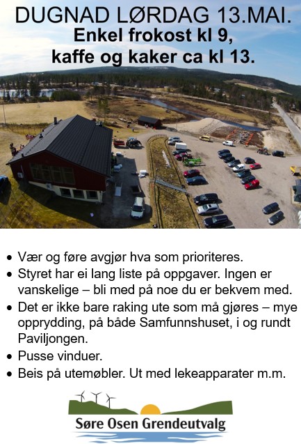 Styret for Grendeutvalget håper på en økning i frammøte på vår-dugnaden i år. Kom på Samfunnshuset kl 9 lørdag den 13/5, så starter vi med en felles frokost. Vi må selvsagt tilpasse gjøremålene etter både vær og føre. Kaffe og kaker serveres ca kl 13. Håper du kan avse en lørdag for fellesskapet i Søre Osen – vi trenger det mer enn på lenge!