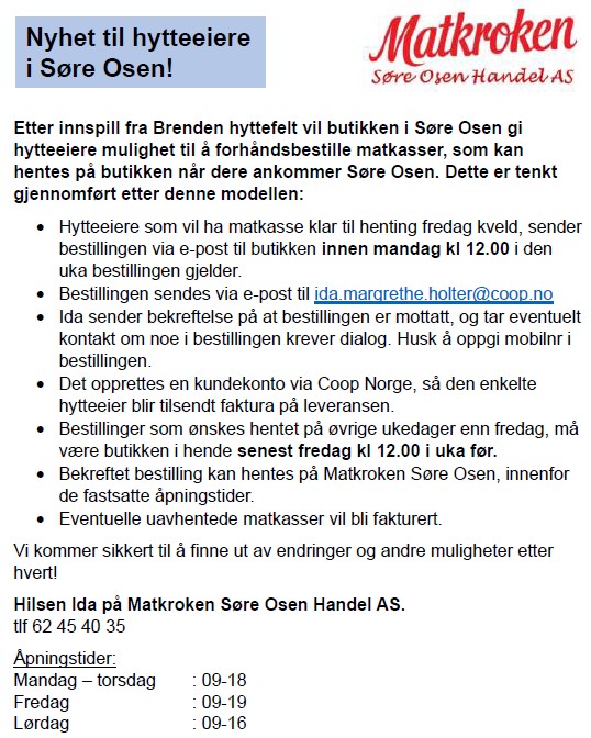 Ida på Matkroken Søre Osen Handel AS vil utprøve nye muligheter for grendas mange hytteeiere. De gis nå muligheten til å forhåndsbestille matkasser, som kan stå klare til henting når de skal på hytta si. Det er en av hytteeierforeningene som har foreslått denne ordningen, som altså nå blir satt ut i praksis. Grendeutvalget har en distribusjonsliste med drøyt 130 hytter, som mottar jevnlige nyheter via e-post. Disse er nå informert.