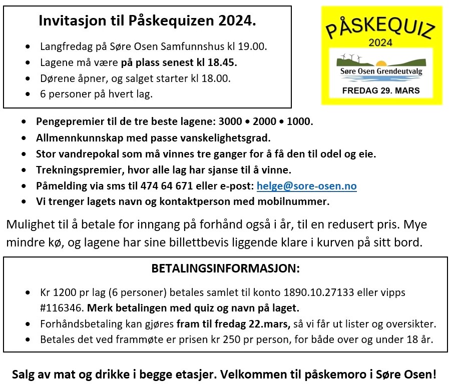 Nå kan det meldes på til årets Påskequiz. Ikke vent med å melde på - har vært fulltegnet i mange år på rad!