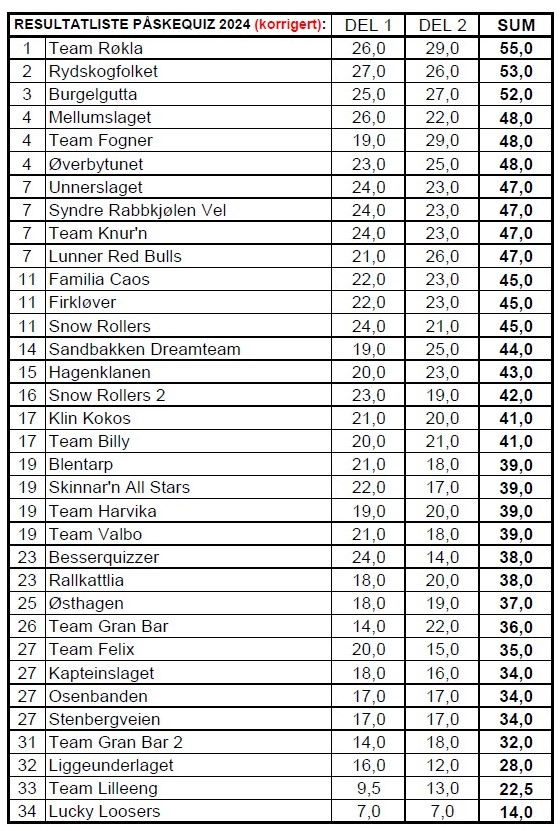 Laget som kommer fra Åmot, bestående av Einar Stormoen, Berit Stormoen, Petter Moe, Marianne Westbye Moe, Hanne Furuheim og Geir Hjermstad vant også i fjor. De ble pustet i nakken av Rydskogfolket, som ledet med ett poeng etter del 1. Det ble som tidligere år en trivelig quizkveld på Samfunnshuset, med stinn brakke. Det ligger masse bilder fra arrangementet på vår facebookside