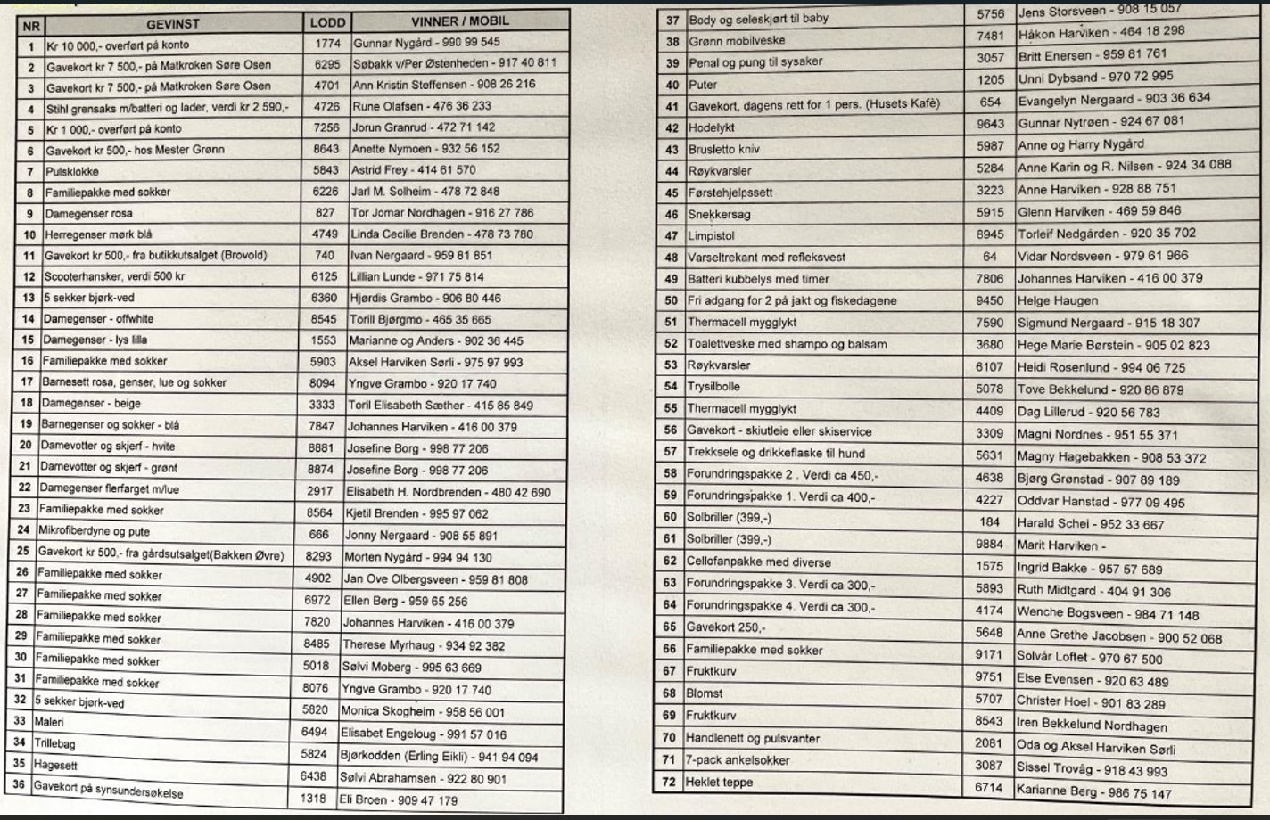 Her er komplett liste over vinnerne på årets Sommerlotteri. Takk til alle som har kjøpt lodd og involvert seg i jobben omkring lotteriet. Alle 200 loddbøker ble solgt, så resultatet ble knallbra!