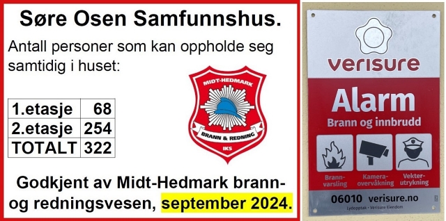 Via Verisure har styret for SOG gjort avtale om en oppgradert og dekkende avtale for brannsikkerheten på Søre Osen Samfunnshus. Hvis en røykvarsler blir utløst varsles Verisure, som umiddelbart tar kontakt med utvalgte lokale personer. Et kamera vil da vise livebilder fra stedet røykvarsleren som utløste alarmen er. Alle er flinke til å bruke avtrekk ved ovner, og det nye ventilasjonsanlegget bør hindre at damp fra matlaging bidrar til falske alarmer. Oppgraderingen innebærer ingen endringer og behov for kunnskap for leietakere og brukere av huset.
