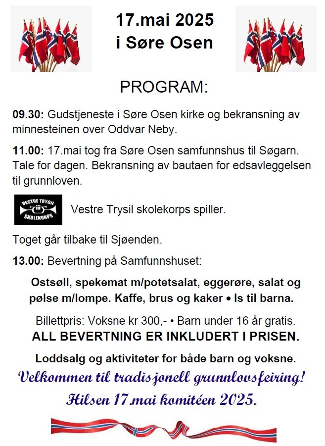 Årets 17.mai-komite er godt i gang med forberedelsene, og har programmet klart. Håper været blir bra, så det blir en fin opplevelse for barn og voksne i både hus og hytter. I år faller nasjonaldagen på en lørdag, og sikkert mange som er på hytta denne helga.